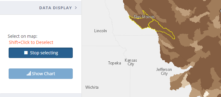 + SelectClicking the Select button allows individual map feature selection. Multiple features can be selected. To unselect, hold the Shift key then Click the feature to unselect it. After all features of interest have been selected, click Stop Selecting.