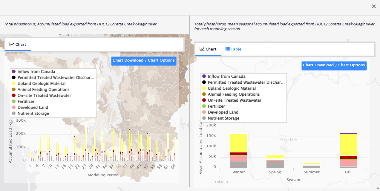 Opening a chartClicking on a displayed map feature will generate two charts showing the individual sources for the selected feature. One chart represents the accumulated load by source for all modeling periods. The other chart represents the mean accumulated load by source and season.