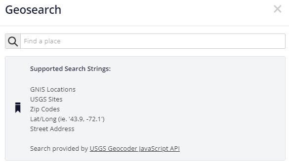 SearchingIn addition to city, state, zip code, or general place names, USGS gaging stations and Hydrologic Unit Codes (HUCs) are also searchable.