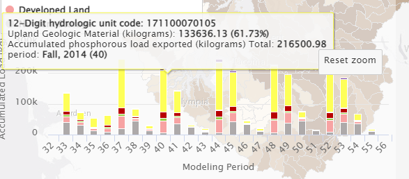 Selected Chart SegmentTo see a magnified segment of the chart, click+drag over the chart bars. The selected features are highlighted on the map. Moving the mouse over the chart bars will give the values for each source as well as show an additional highlight to the cooresponding map feature. To return to the previous chart view, click the Reset zoom button in the top right of the chart window.