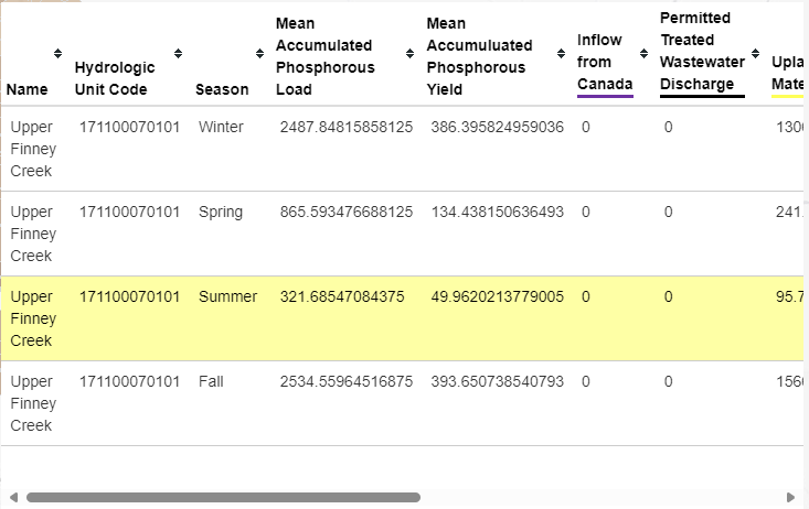 The seasonally averaged accumulated load exported from a HUC12 watershed.